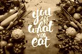 Frame of healthy food vegetables and beans on wooden table with "you are what you eat" lettering
