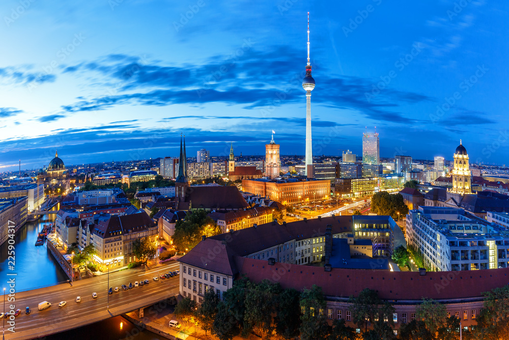 Berlin Skyline Fernsehturm Rotes Rathaus Panorama bei Nacht Deutschland Stadt