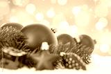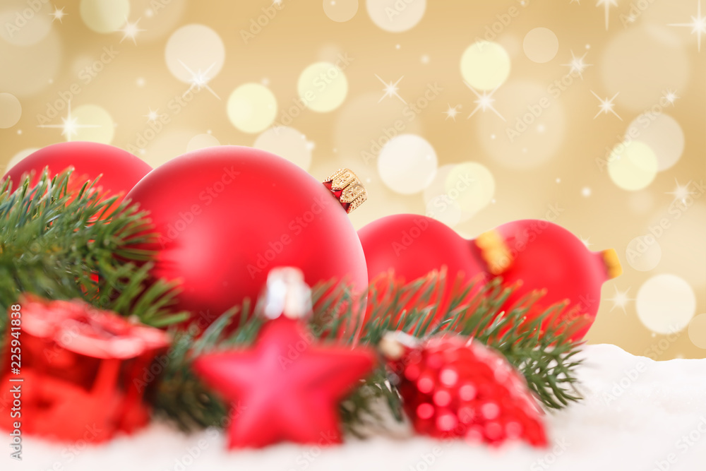 Weihnachten rote Weihnachtskugeln Weihnachtsdeko Weihnachtsdekoration Gold Dekoration Schnee Textfreiraum Copyspace