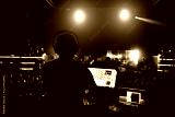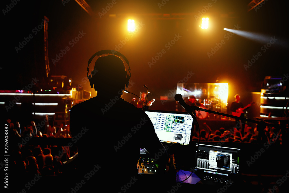 Club, disco DJ playing and mixing music for crowd of happy people. Nightlife, concert lights, flares