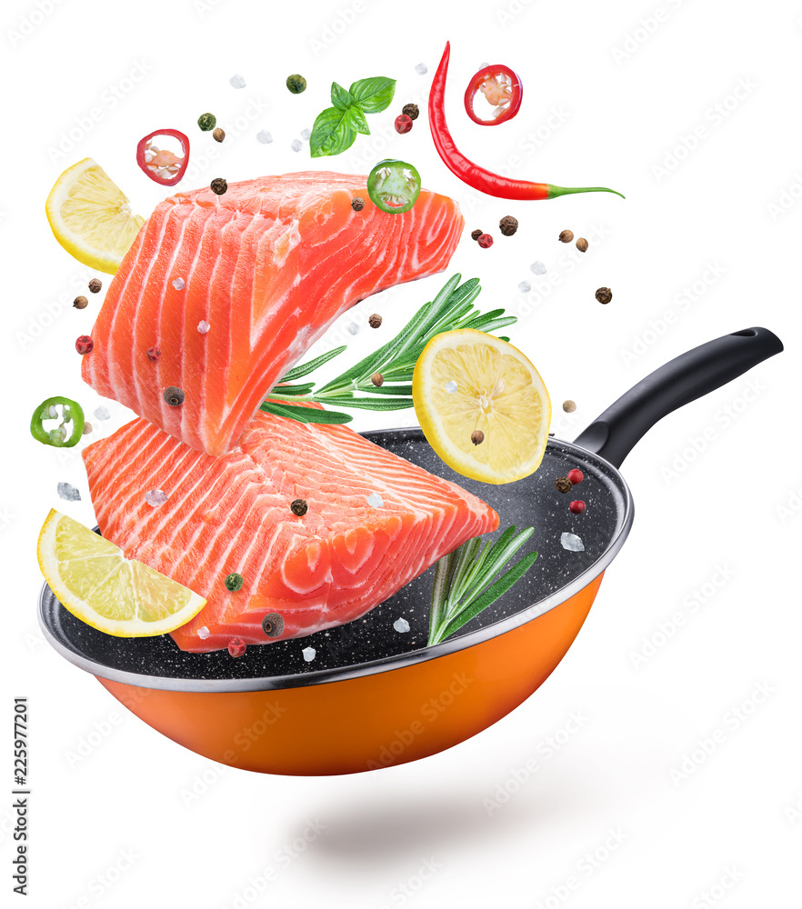 Flying salmon steaks and spices over a frying pan. File contains clipping path. Isolated on a white background.