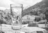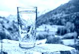 Glass of water on the stone. Blurred snow mountains tops and green forests at the background.