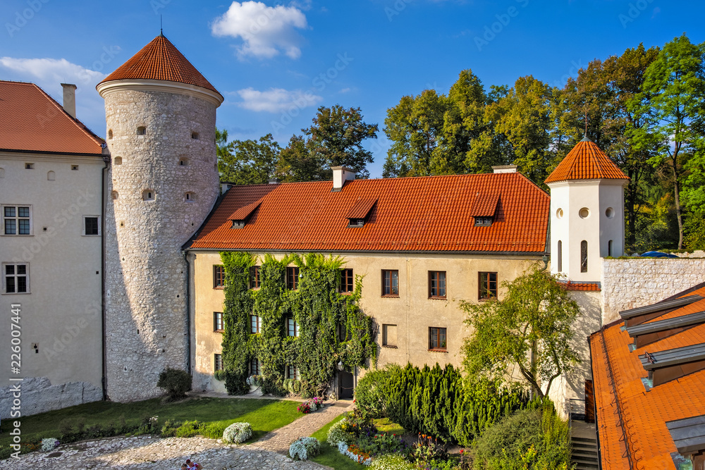 Pieskowa Skala, Poland - Inner courtyard and gothic tower of historic castle Pieskowa Skala by the Pradnik river in the Ojcowski National Park