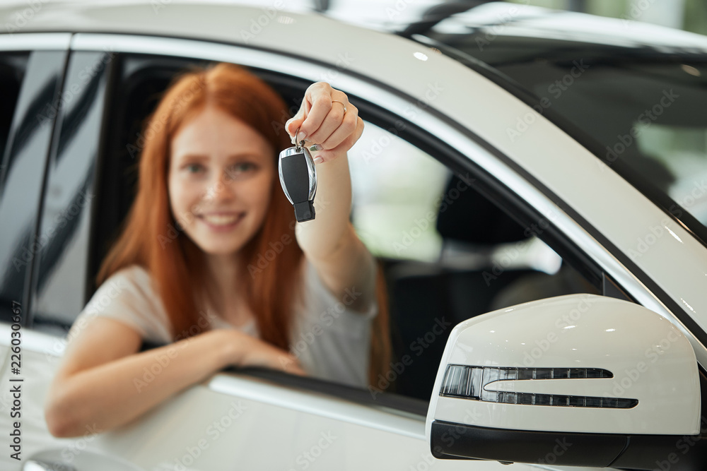 Ready to get on the road. Attractive young red haired woman sitting at the front seat of the car demonstrates a key and smiling at camera