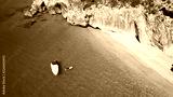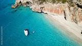 Aerial drone bird's eye view photo of popular beach of Milos with turquoise clear waters and sun beds, island of Lefkada, Ionian, Greece