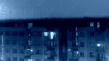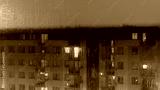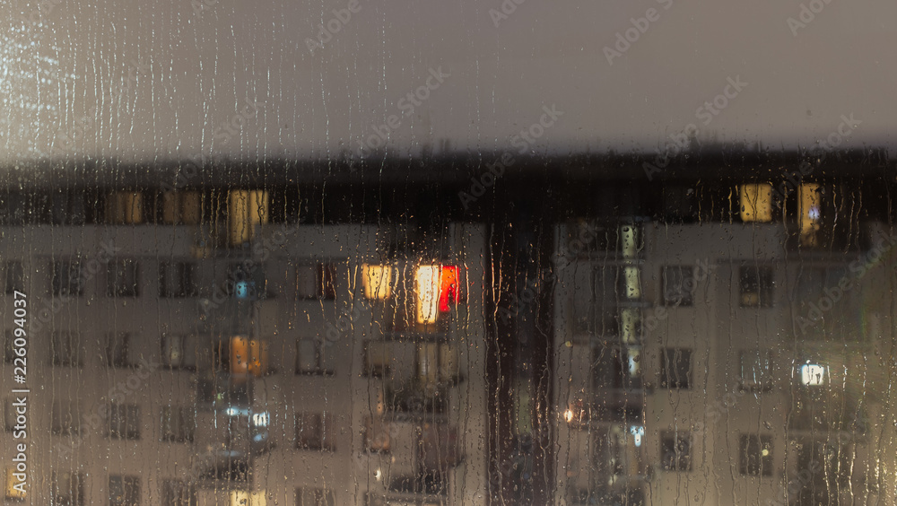Rainy evening and the view of the rain-covered glass through which you can see a fuzzy block of flats