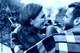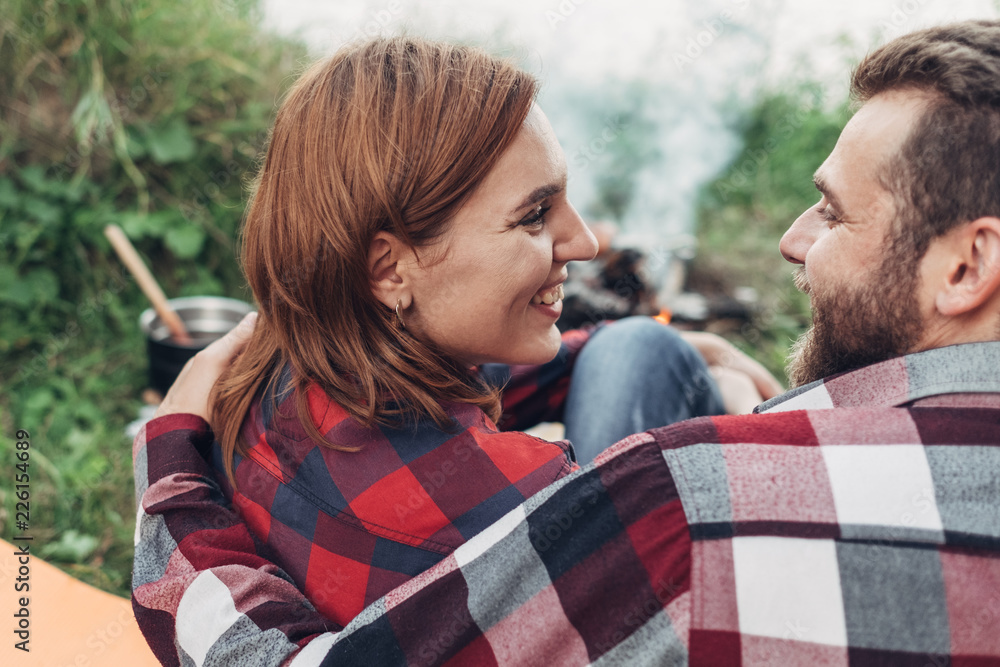 Happy Young Couple Sitting by Bonfire Having Picnic on the Nature