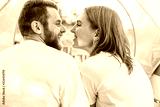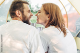 Happy Young Couple Sitting in the Tent and Having Picnic on the Nature