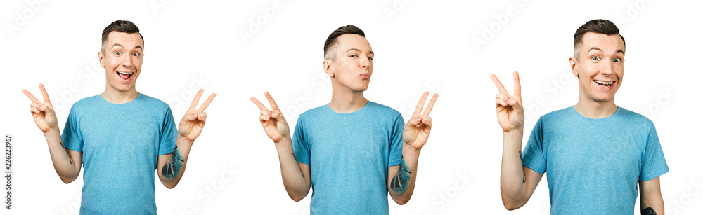 Set of portraits of young guy showing victory sign isolated on a white background.