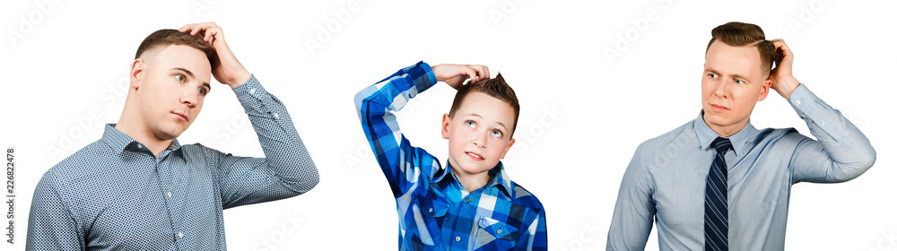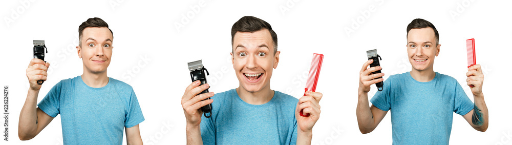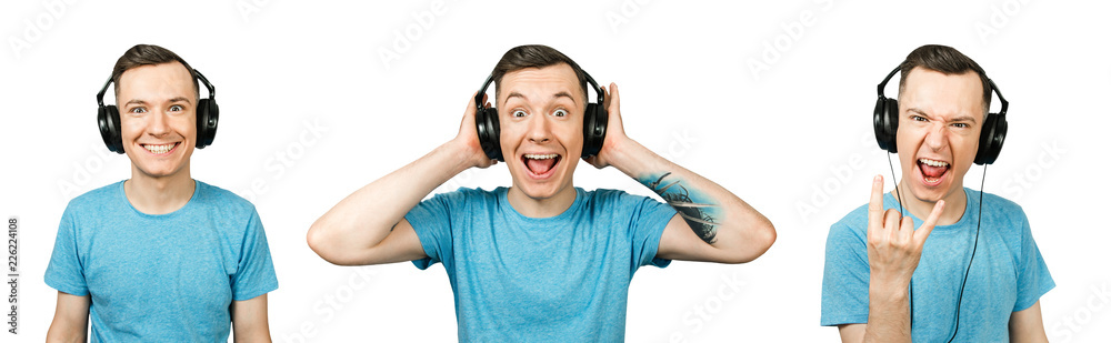 Set of portraits of young joyful guy in a headphones listening music isolated on a white background.