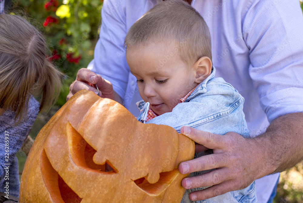 Little boy having fun while carving pumpkins for Halloween