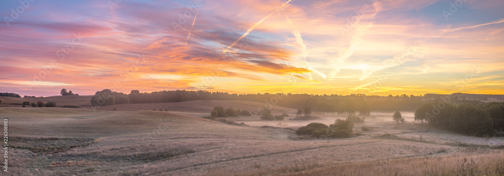 beautiful, multicolored dawn above the panorama of fields and meadows. landscape picture resembling Italian Tuscany. Autumn-Poland, Drawsko Lake District