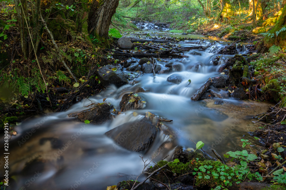 cascades and mini waterfalls on a small forest stream. The stream is created on the springs at the lake or in the Drawsko Lakeland