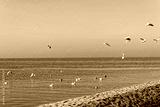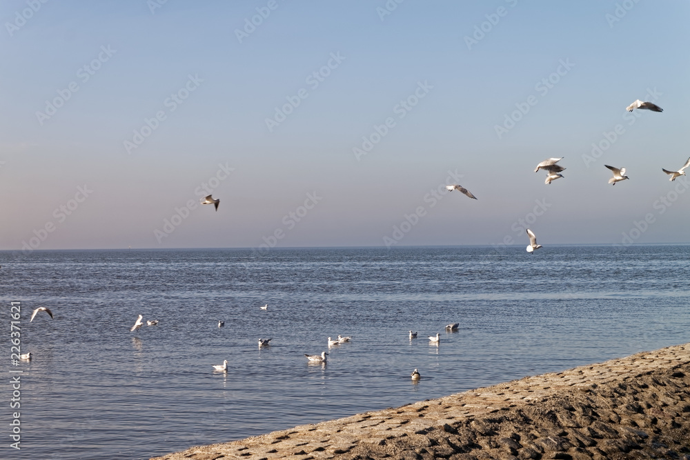 North Sea – flock of white seagulls at the pier.
