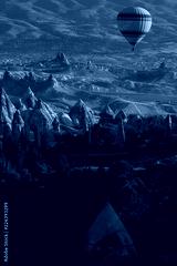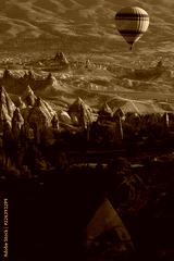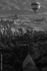 Beautiful landscape of Cappadocia valley with hot air balloons in background at sunrise