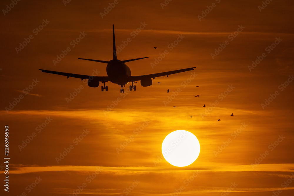 Silhouette of plane near to sun and birds with beautiful red clouds in background