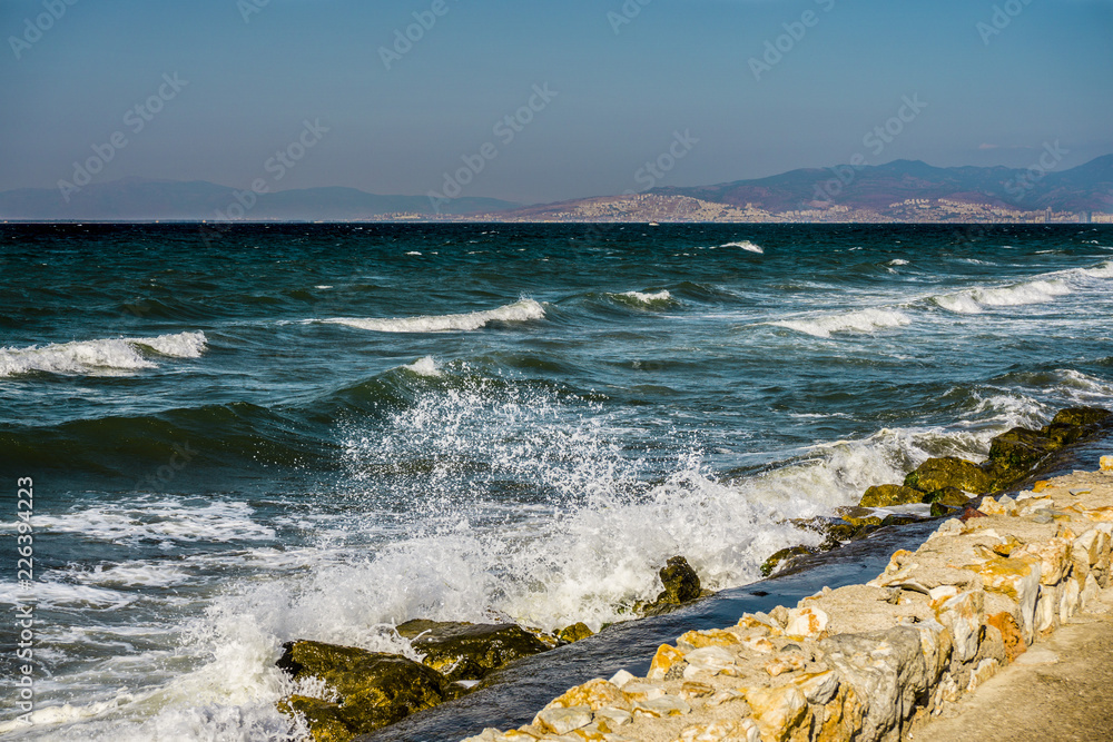 Blue ocean or blue sea rocks. Turquoise sea big waves crashing / hitting / splashing on the rocks at coast / shore of ocean or sea. Beautiful scenic nature landscape background in Guzelbahce, Izmir.