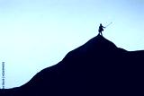 Landscape with a man in top of a peak taking a selfie with his phone on the stick at sunset.