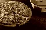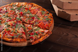Appetizing pizza on the cutting board with cardboard boxes on wooden background