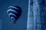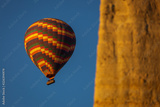Colorful hot air balloon flying over a beatiful blue sky in background