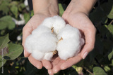 natural product, raw cotton flowers on woman's hands on green yard outdoor background