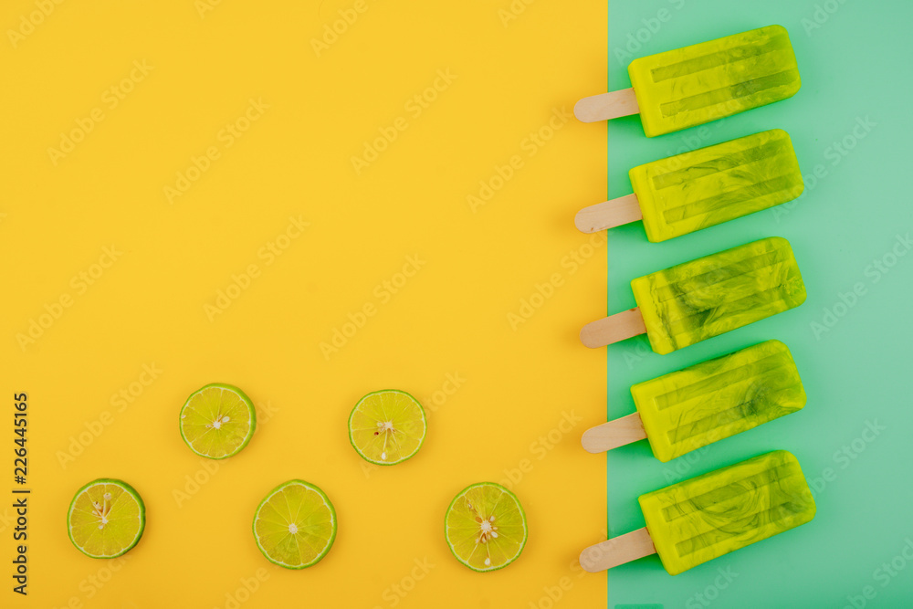 modern pastel background of lemon and lime Popsicle on yellow and green background