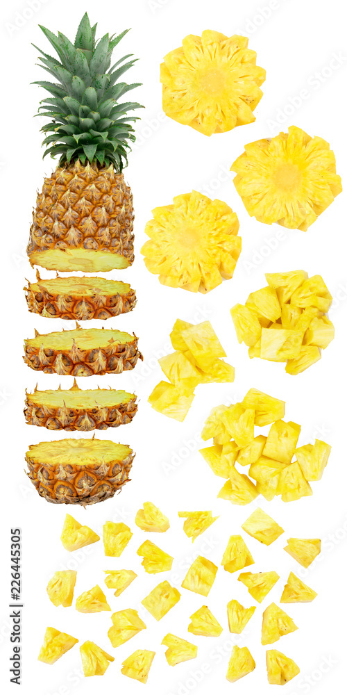 Close-up natural fresh fruit of cutted and sliced pineapple, isolated on white background with clipping path