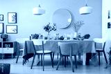 Wooden chairs at table with tableware in dining room interior with lamps and round mirror. Real photo