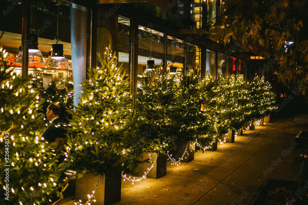 Geschmückte Weihachtsbäume in New York bei Nacht