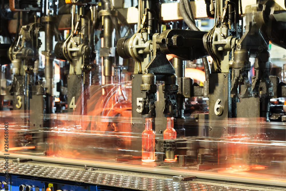 Hot glass bottles on a glass production line