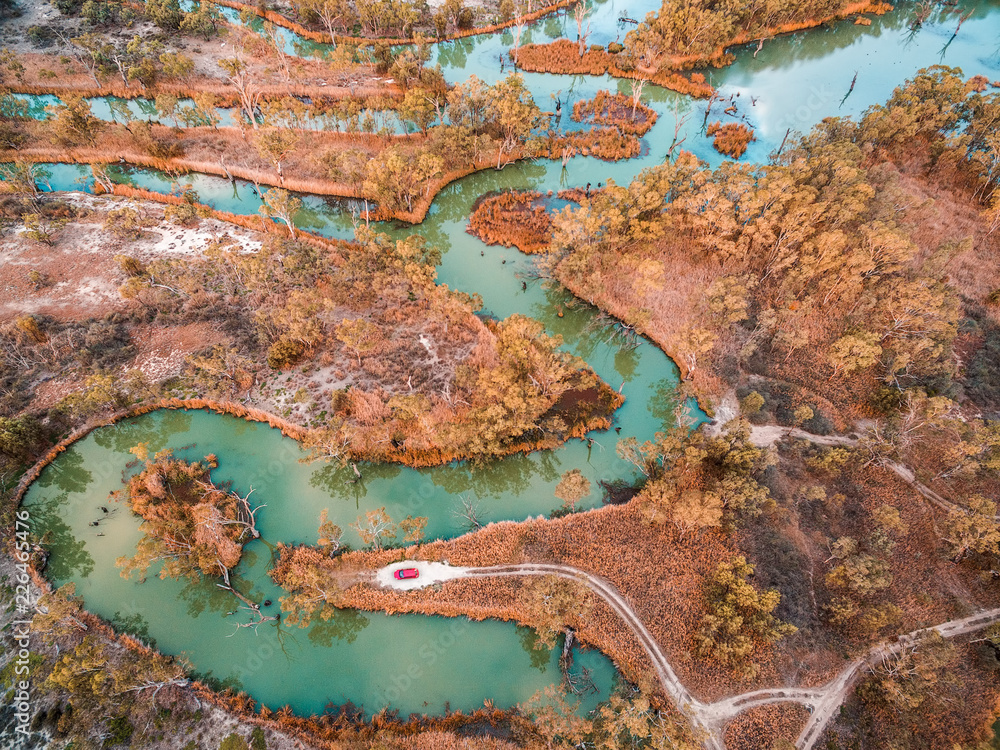 Small red car at the end of dirt road on the edge of beautiful river among gum trees in Australia - aerial view