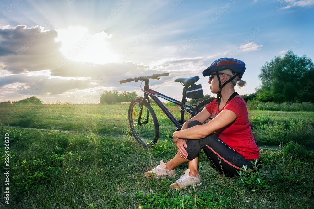 Girl in bicycle helmet sits near bicycle and looks at the sunset