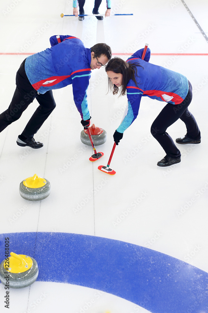 Mecz curlingowy. Młodzi ludzie na lodowisku.