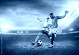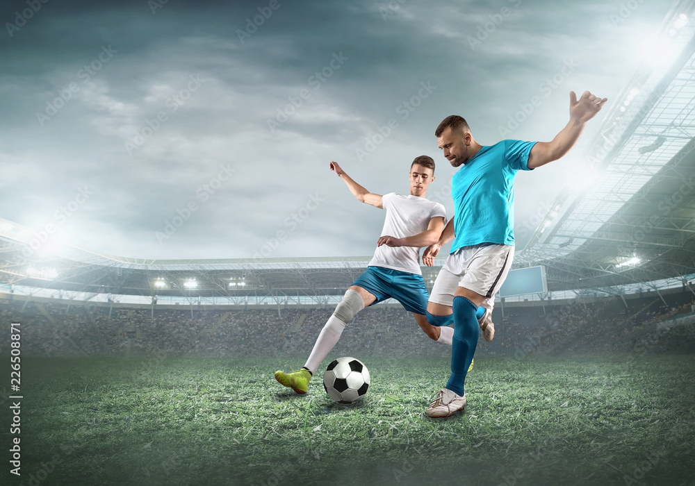 Soccer player on a football field in dynamic action at summer day