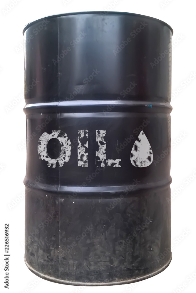 Old oil barrel isolated on white background. Blank realistic black oil barrel.