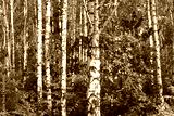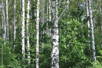 Beautiful birch trees with white birch bark in birch grove with green birch leaves