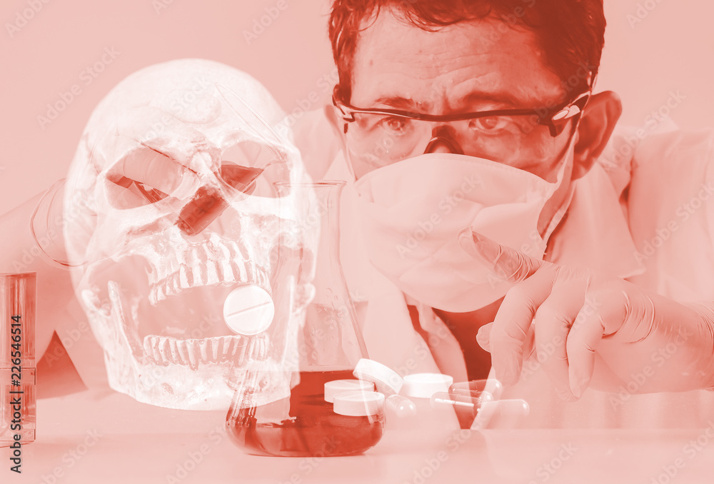Double exposure skull and Laboratory glassware or test tube . science concept.