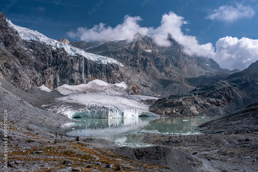 Closeup of stray one, lonely calico cat standing outside by house, home wooden, deck, glass balcony wanting, waiting, asking, begging to go inside, opening door with front paw