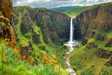 Maletsunyane Falls in Lesotho Africa. Most beautiful waterfall in the world. Green scenic landscape of amazing water fall dropping into a river inside canyons. Panoramic views over the great falls.