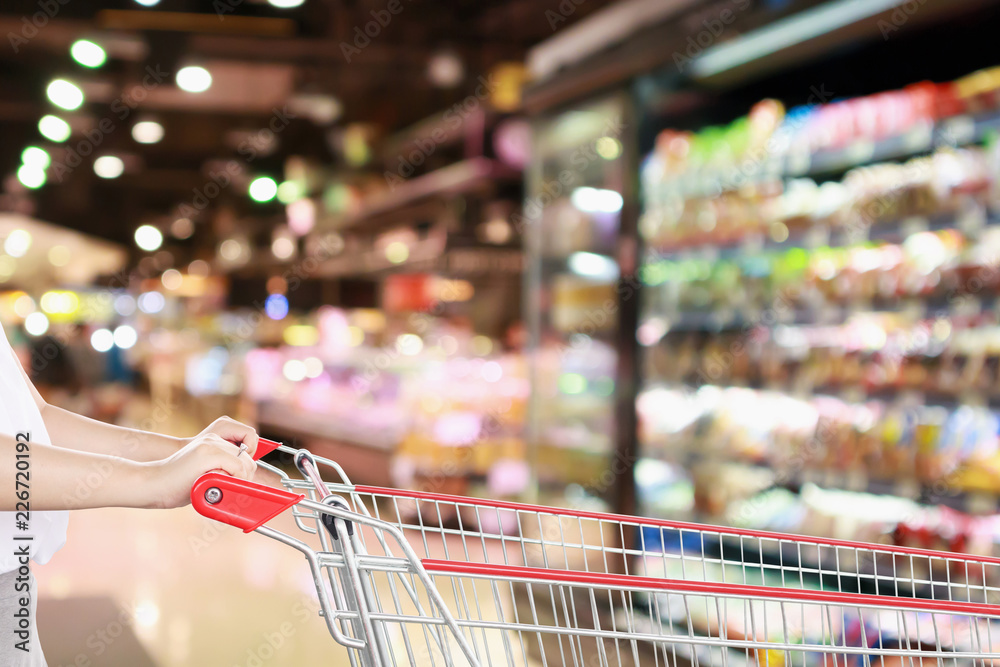 woman hold shopping cart with blur supermarket fresh product shelves background