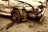 A close up of a broken car after a traffic accident left in the car park. Heavy damage of a bumper and a wheel after a side-on collision. Crumpled side of a car as a result of a clash. Clunker.
