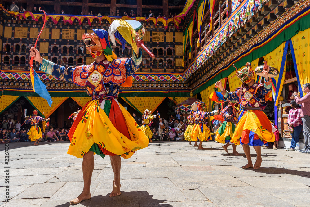 Bhutan Monk dancing for colorful mask dance at yearly Paro Tsechu festival in Bhutan