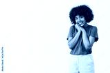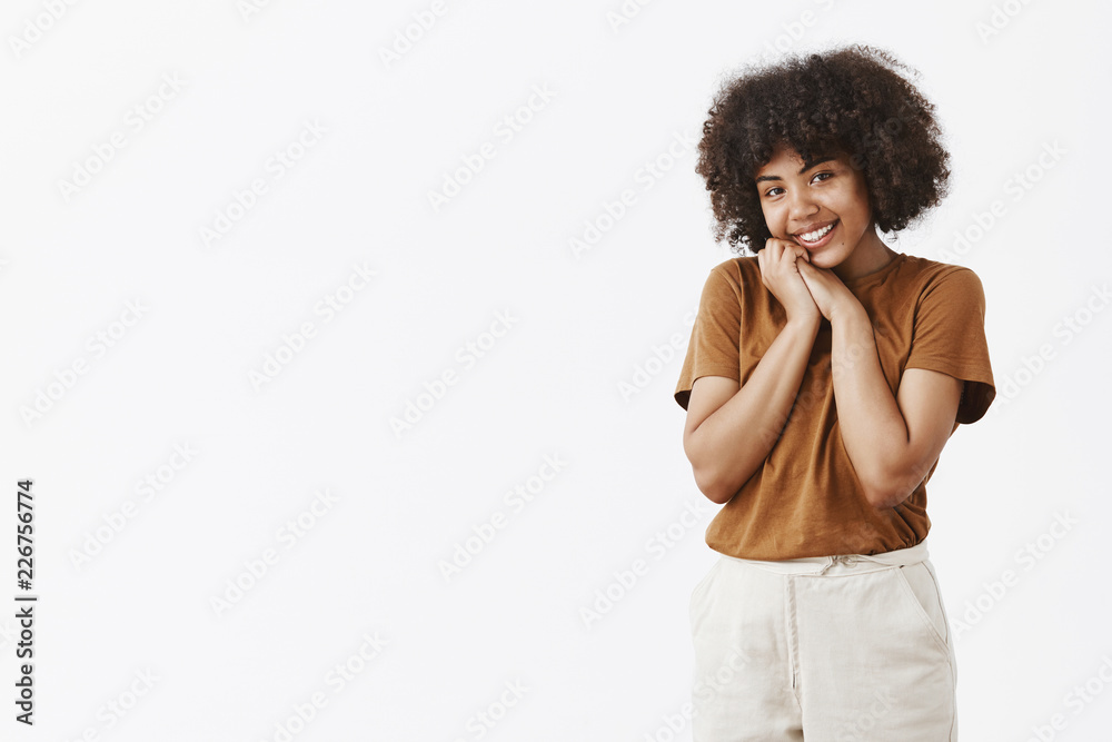 Cute and touched silly African American woman with curly hair in brown t-shirt tilting head and leaning it on hands smiling with charmed and pleased expression looking with affection at camera