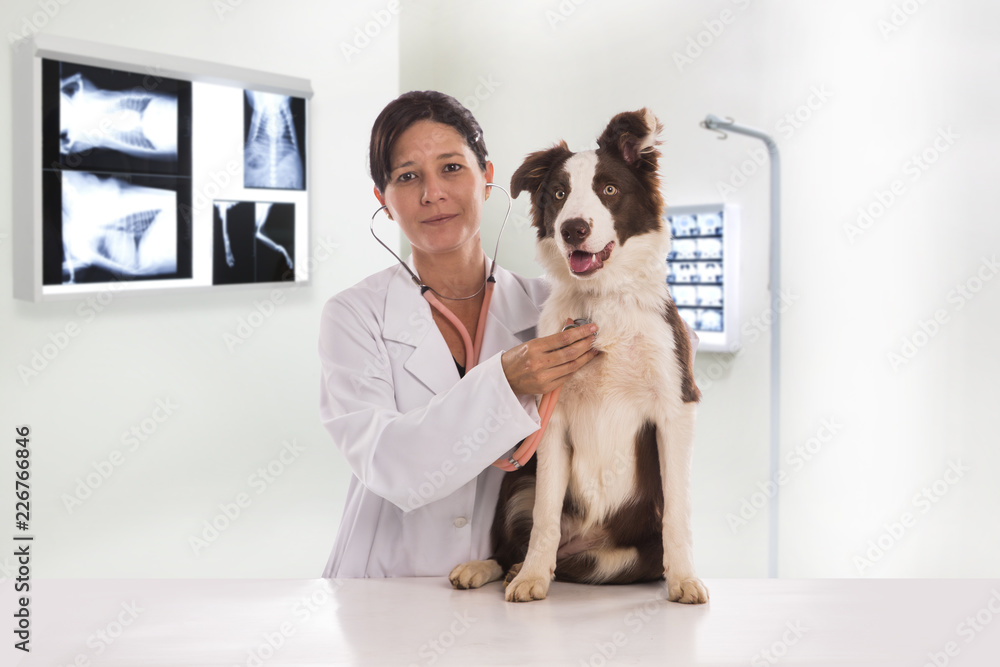 Veterinarian examining a dog while doing checkup at clinic. Border Collie Dog..