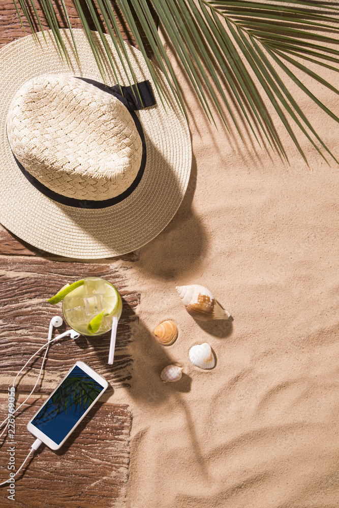 Top view of sandy beach with towel frame and summer accessories. Background with copy space and visible sand texture. Right border made of towel