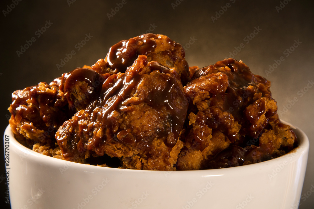 Bucket full of crispy kentucky fried chicken with smoke and barbecue sauce on brown background. Selective focus.