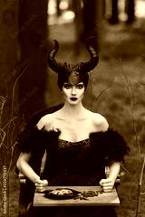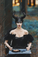 Beautiful and fashionable brunette slim model girl in the image of Maleficent with fork and knife in her hands sits at the table among mystic forest - fairytale story, cosplay
