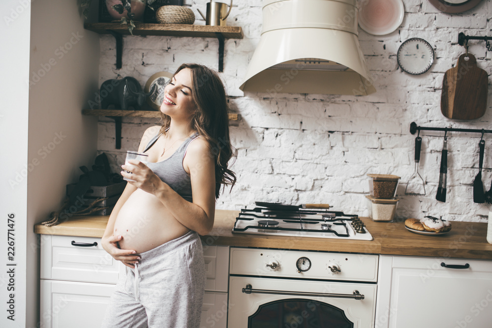 Pretty pregnant woman in kitchen having breakfast and cup of milk