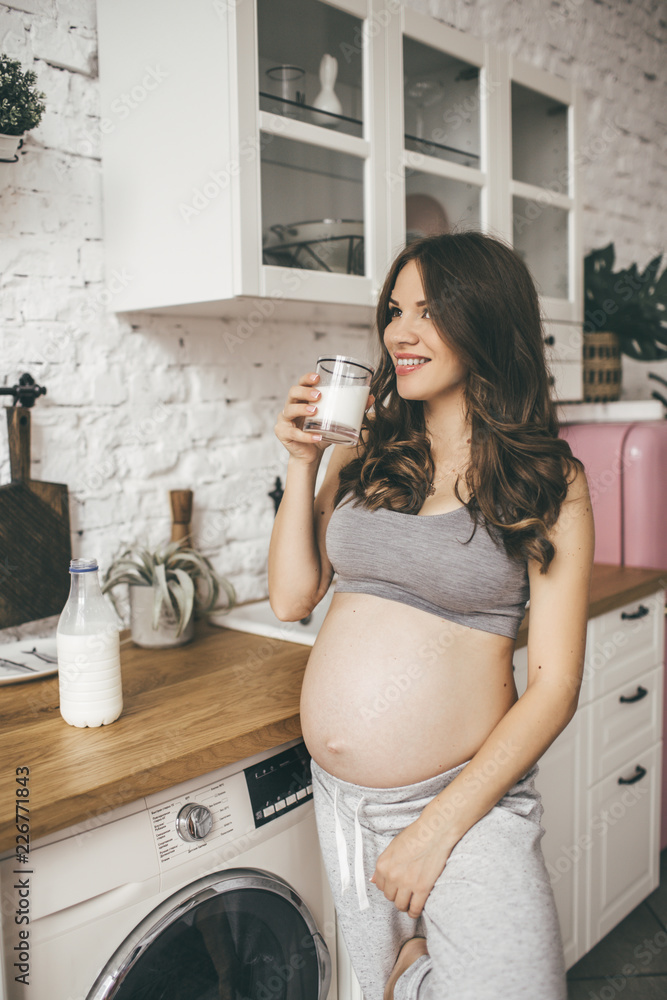 Pretty pregnant woman in kitchen having breakfast and cup of milk
