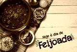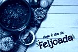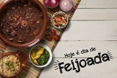 Brazilian Feijoada Food. Written "Today is Feijoada's Day" in Portuguese. Top view with copy space.